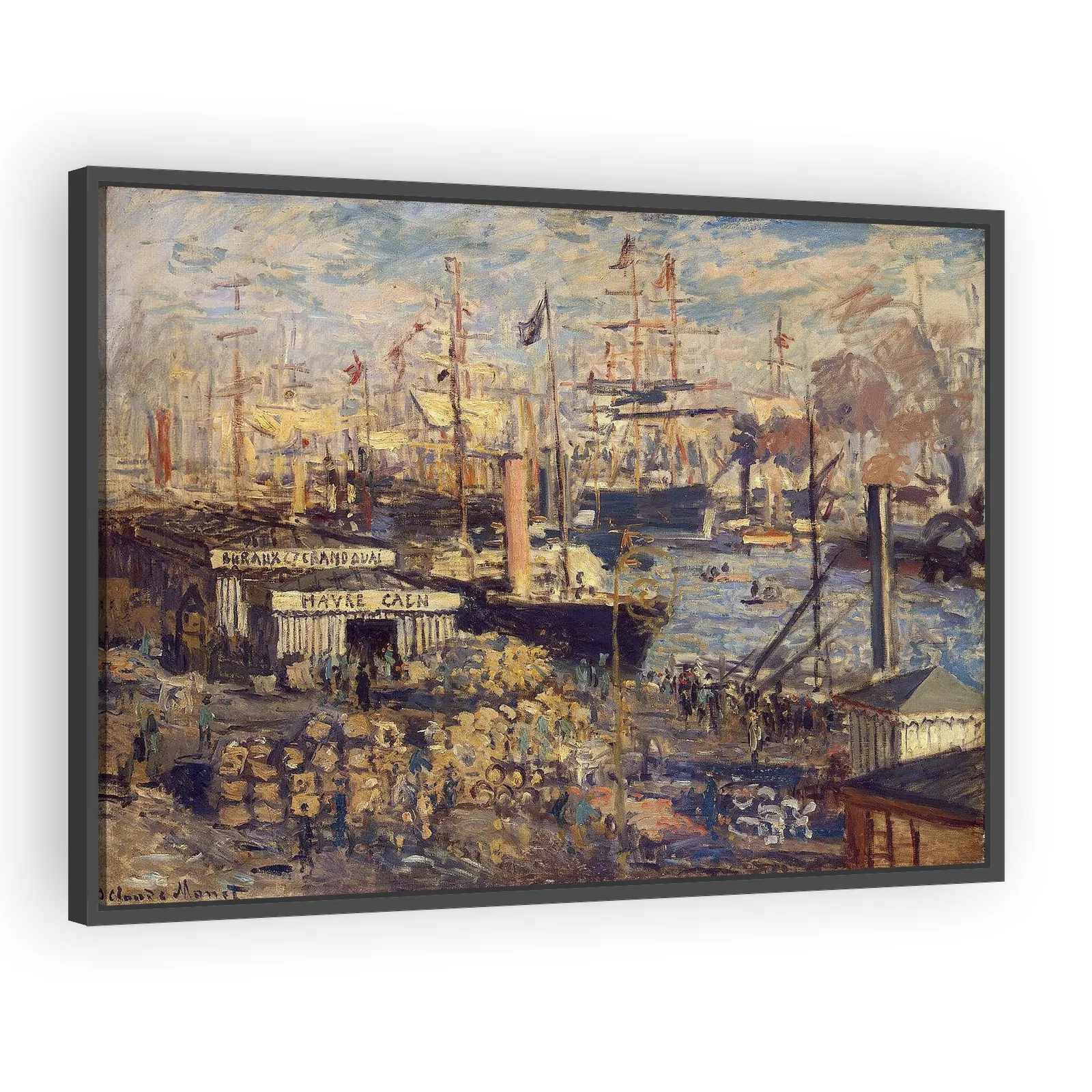 Claude Monet’s Embankment in Le Havre (1874) captures the port city's atmospheric light and maritime activity with loose brushwork and shimmering color — an impressionist celebration of transient effe...
