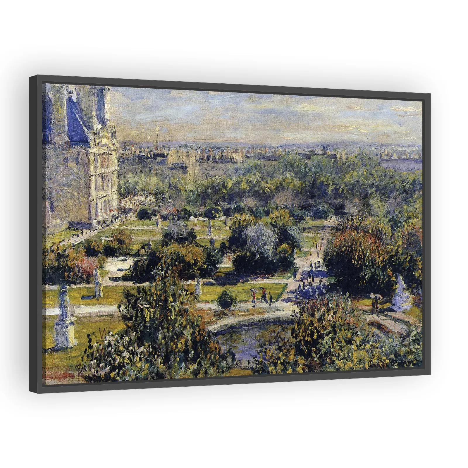 Claude Monet's The Tuileries (Study) captures a Parisian urban park from an elevated vantage, balancing architectural mass and formal garden geometry with a luminous palette of ochres, greens, blues a...