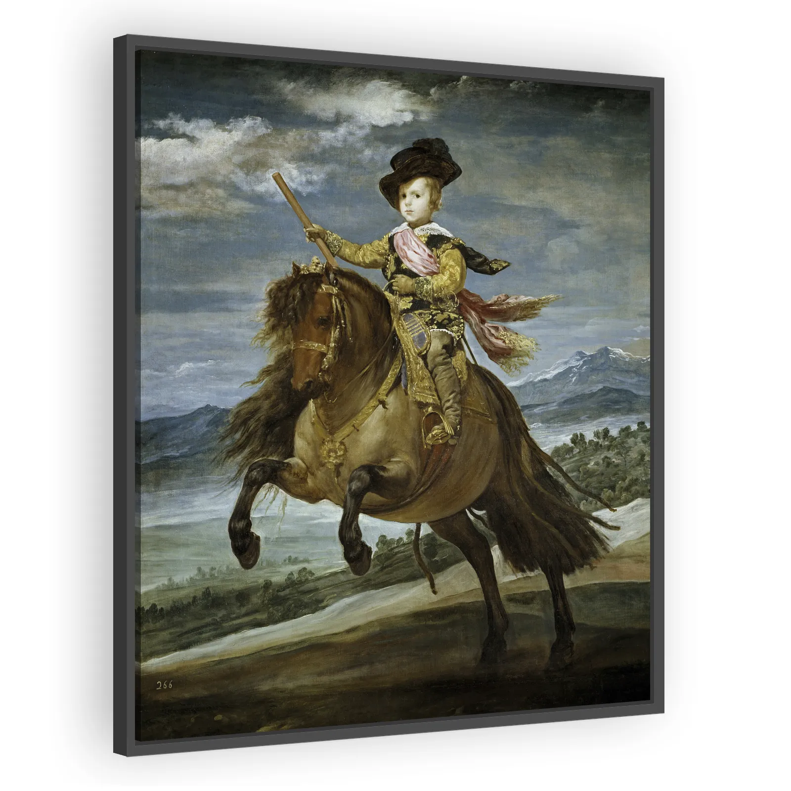 A commanding equestrian portrait by Diego Velázquez (1634) of Prince Balthasar Charles, heir to the Spanish throne. Masterful brushwork and courtly symbolism combine to portray youthful authority and...