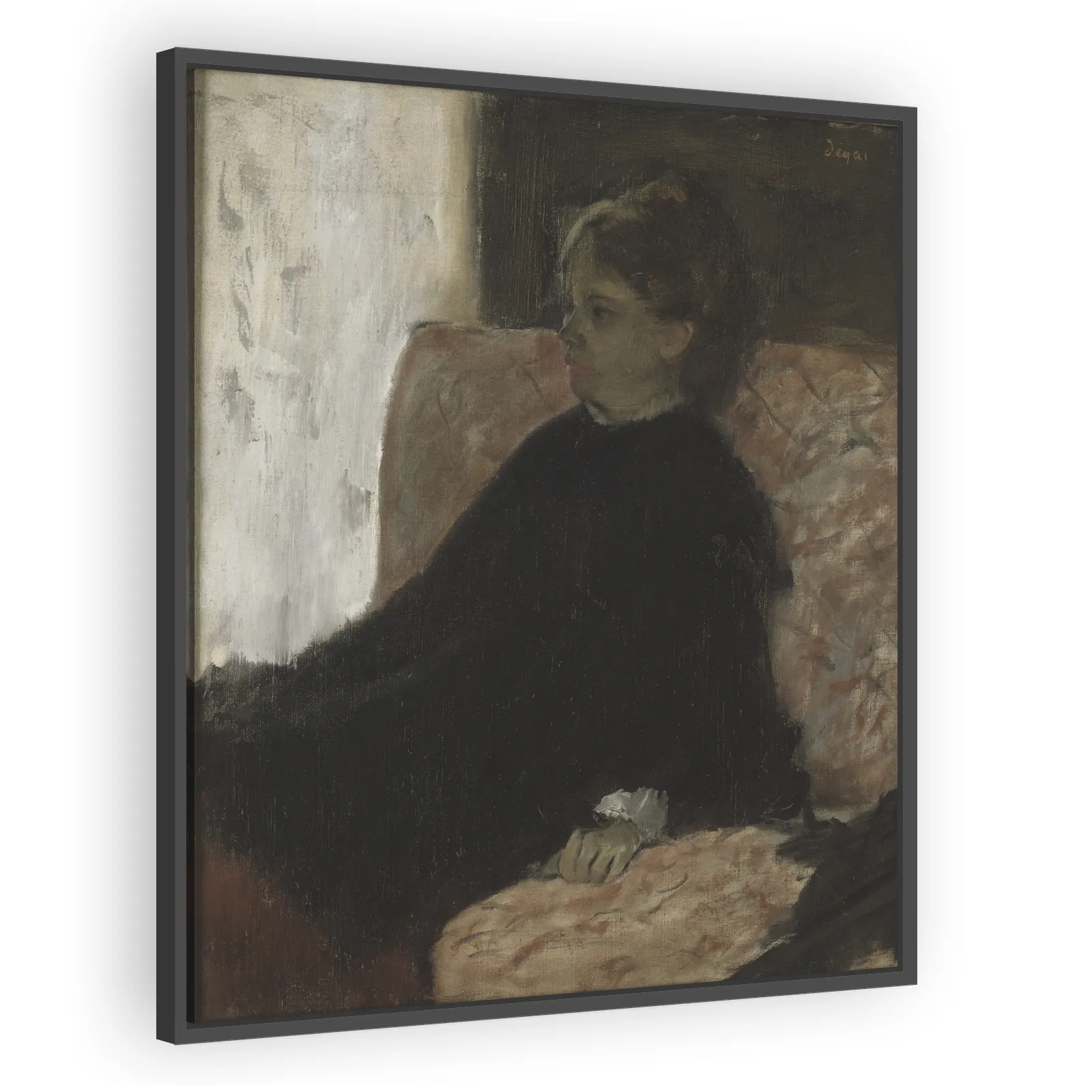 Edgar Degas’ Lady in Black captures a poised woman in a dark dress against a subdued interior. The restrained palette and intimate composition exemplify Degas’ psychological portraits and refined late...