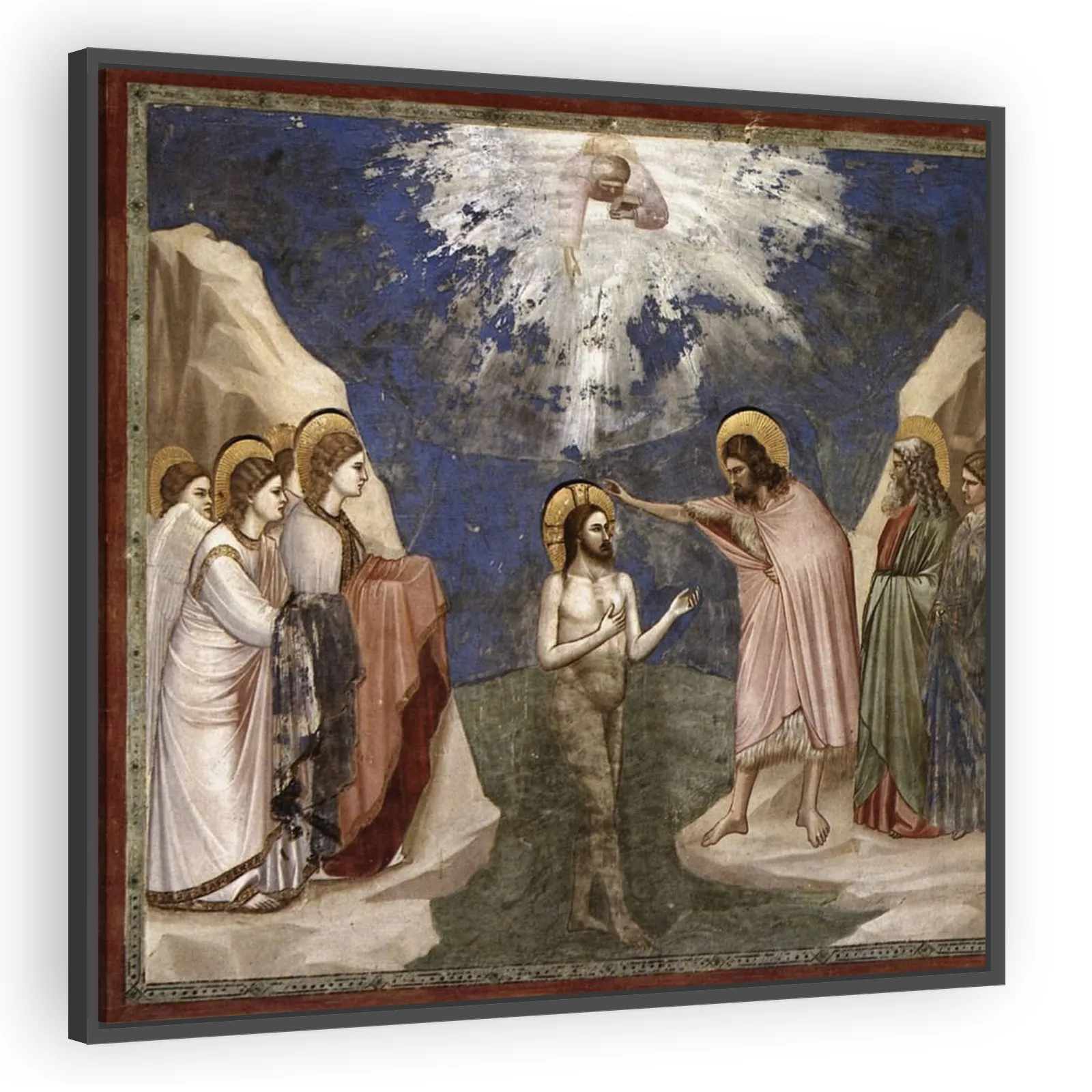 Giotto’s 'Baptism of Christ' (1303), a fresco from the Scrovegni Chapel, marks Proto‑Renaissance naturalism and devotional clarity. The scene emphasizes human presence, spiritual symbolism, and the ar...