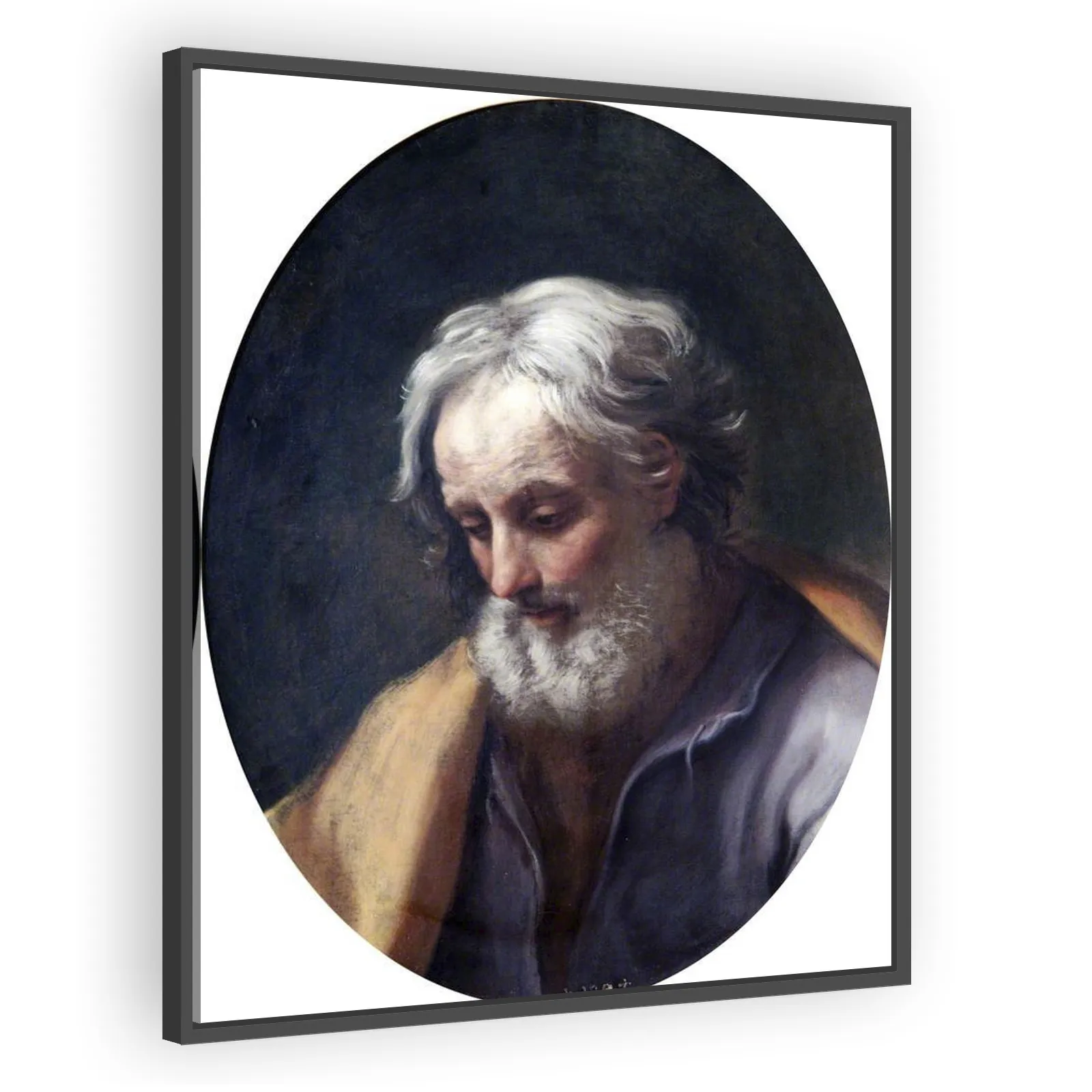 An intimate Baroque study by Guido Reni, Head of Saint Joseph captures serene devotion through refined modelling, luminous chiaroscuro, and graceful idealization — a compelling devotional image for co...