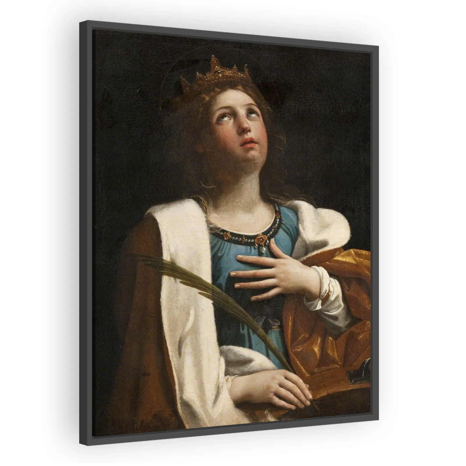 Guido Reni's Saint Catherine (1606) presents the saint with graceful serenity and refined Baroque elegance. A study in luminous color, delicate modeling, and devotional poise—an enduring collectible f...