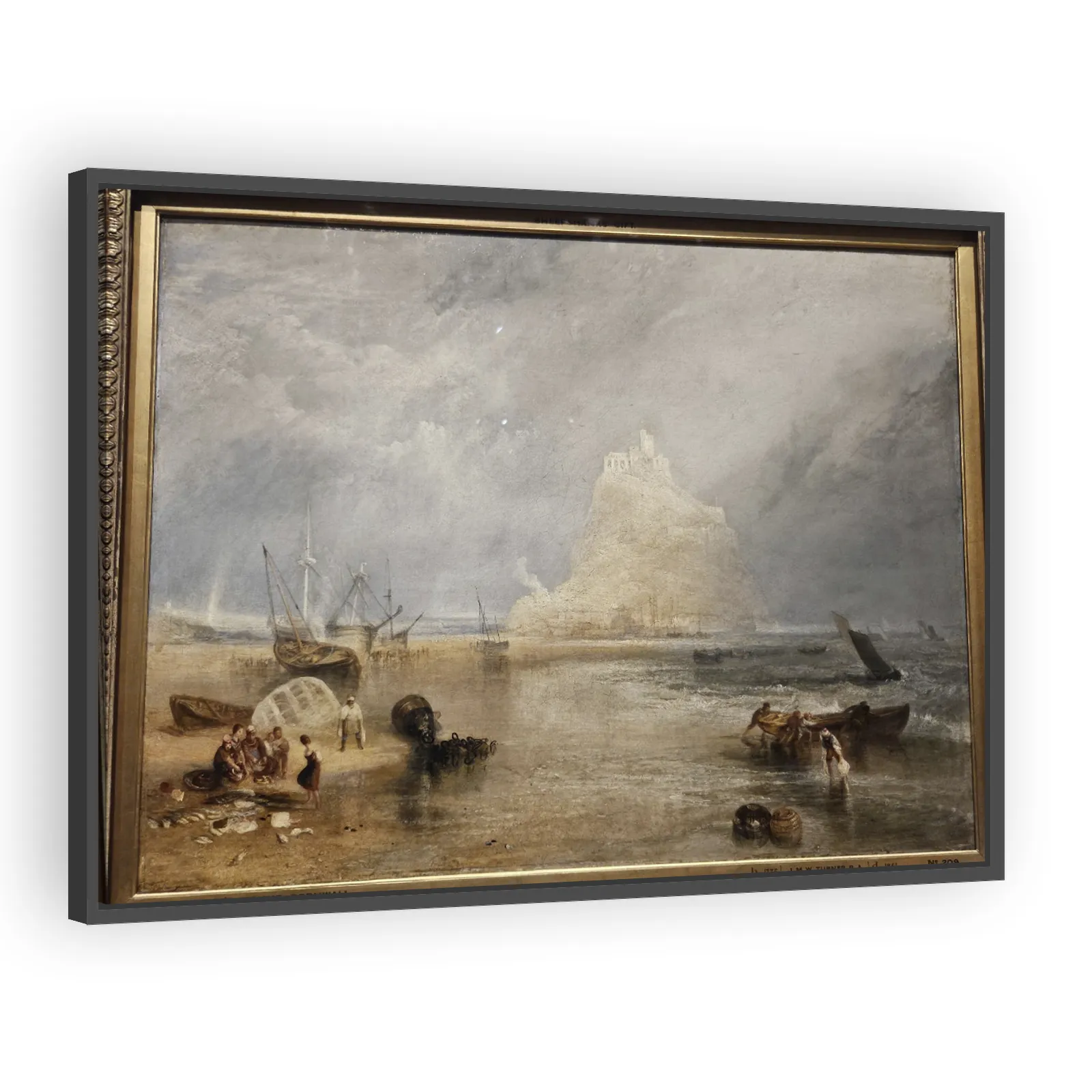 A luminous oil on canvas by J. M. W. Turner (c.1834), capturing the iconic tidal island of St Michael's Mount in Cornwall with atmospheric light and masterful marine effects—an evocative example of Tu...