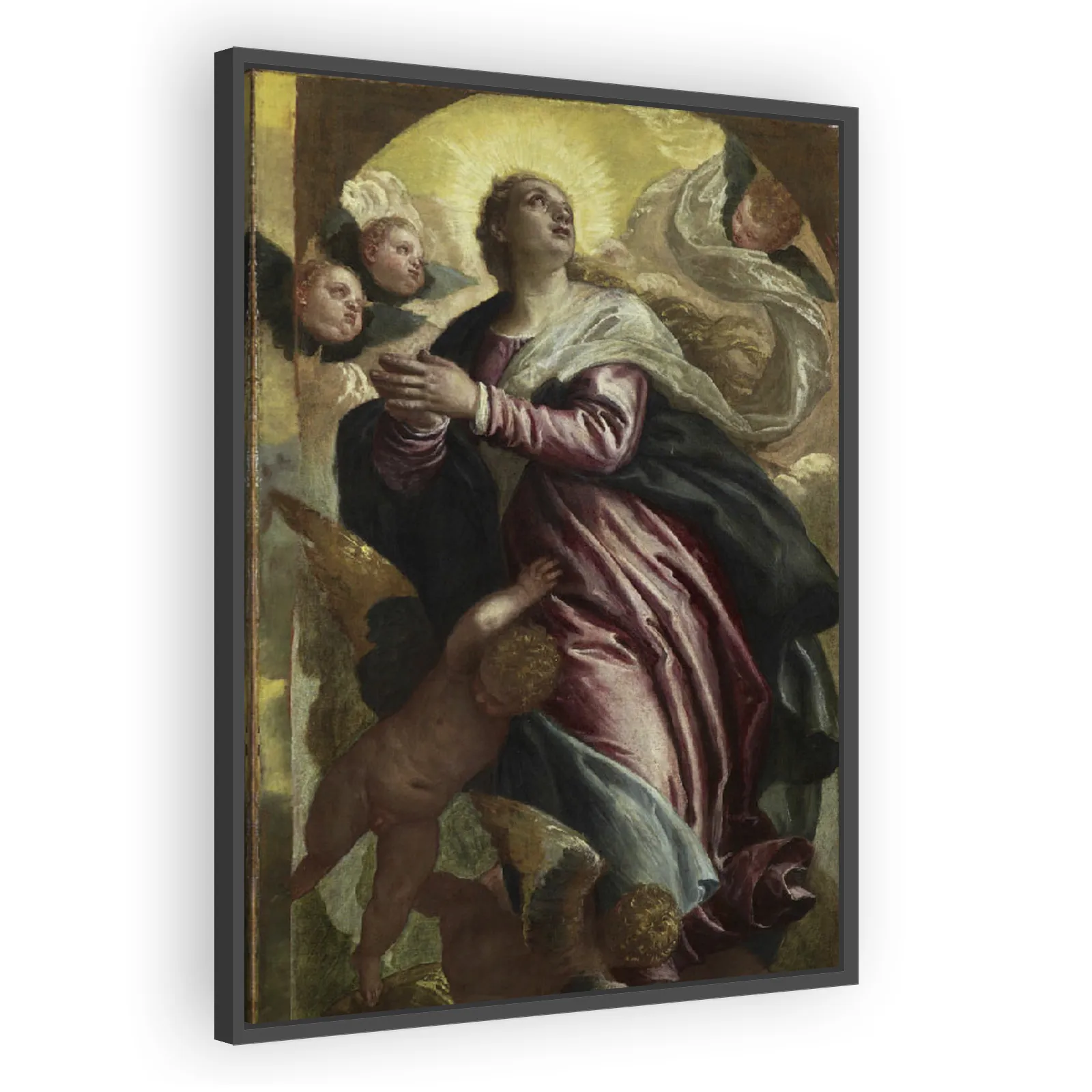 Paolo Veronese’s Assumption of the Virgin (c. 1580) presents the Virgin Mary’s ascent surrounded by luminous figures and rich Venetian color. Exemplifying late Renaissance composition and theatricalit...