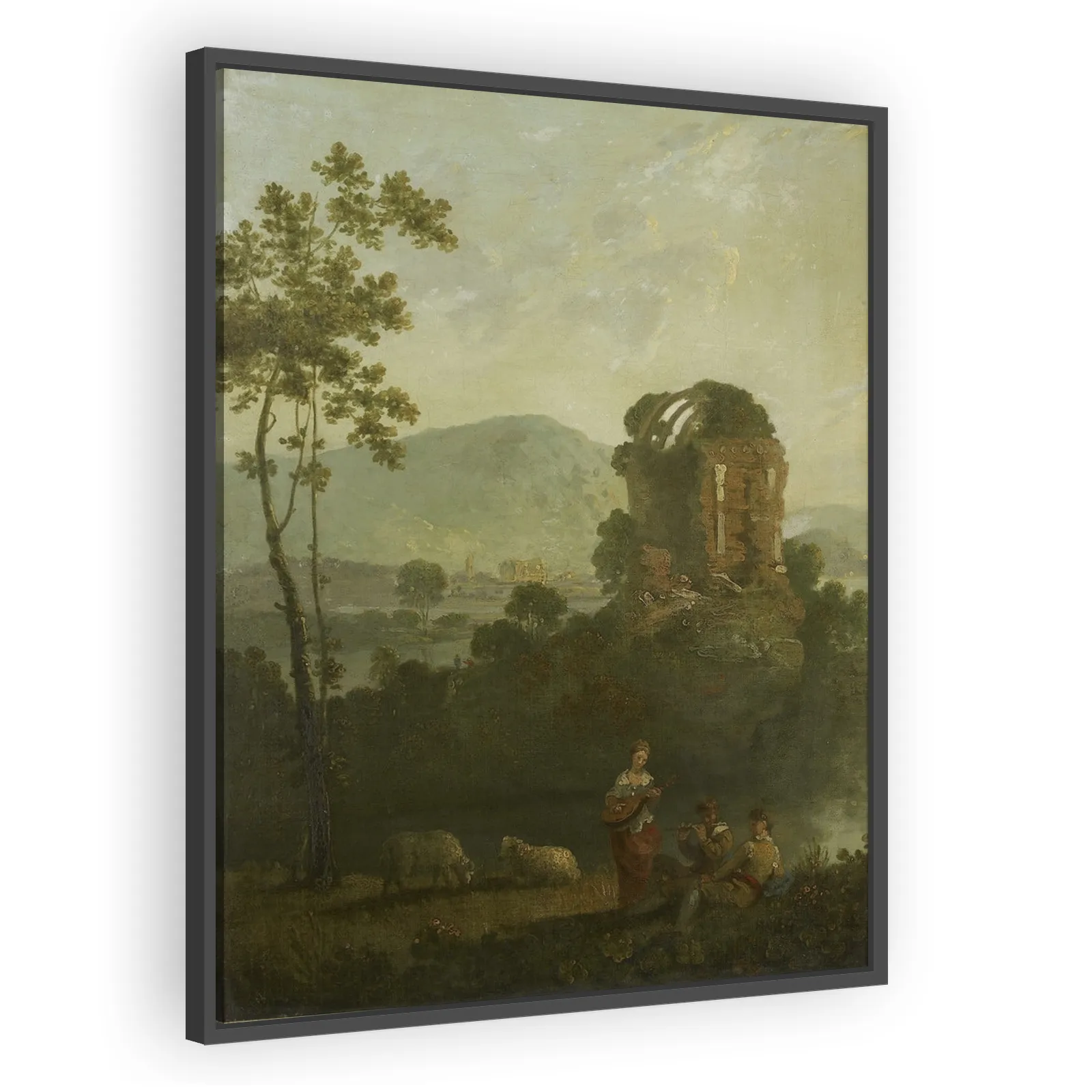 An evocative Richard Wilson landscape that pairs genteel pastoral activity with evocative classical ruins. Elegant composition and atmospheric light make this work a fine example of 18th-century Briti...